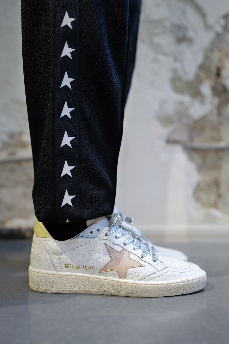 These white leather Golden Goose sneakers have a unique and refined style. Featuring a round perforated tip, they have a lace-up closure adorned with the brand logo. The design is enhanced by a pink side star badge, a logo label on the tongue, and an additional logo on the side. The light green leather heel adds a touch of subtle contrast, while the vintage-effect finish and rubber sole complete the whole with a casual and elegant look. Each pair, carefully handmade<br>Made in Italy