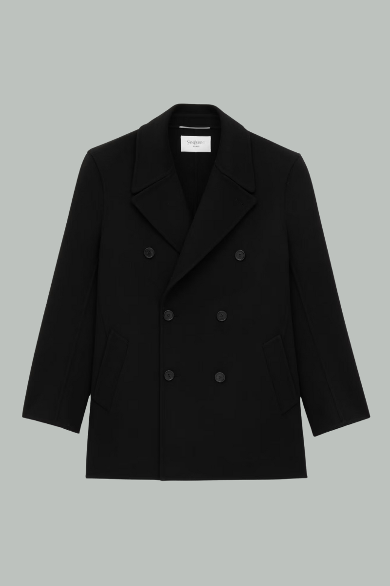 Ce caban à double boutonnage, confectionné en laine certifiée, se distingue par son col Ulster et ses épaules matelassées. Il présente une fermeture croisée à six boutons, deux poches passepoilées sur le devant et quatre boutons sur les manchettes, alliant élégance classique et finitions soignées.