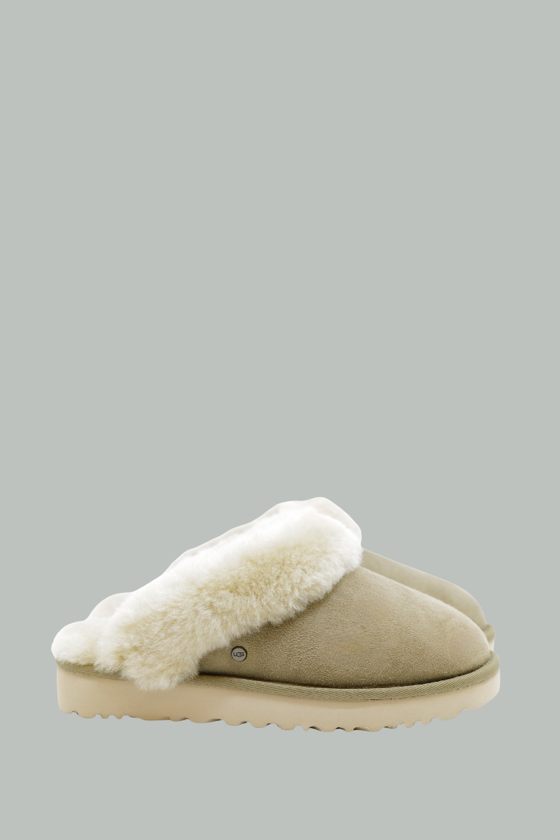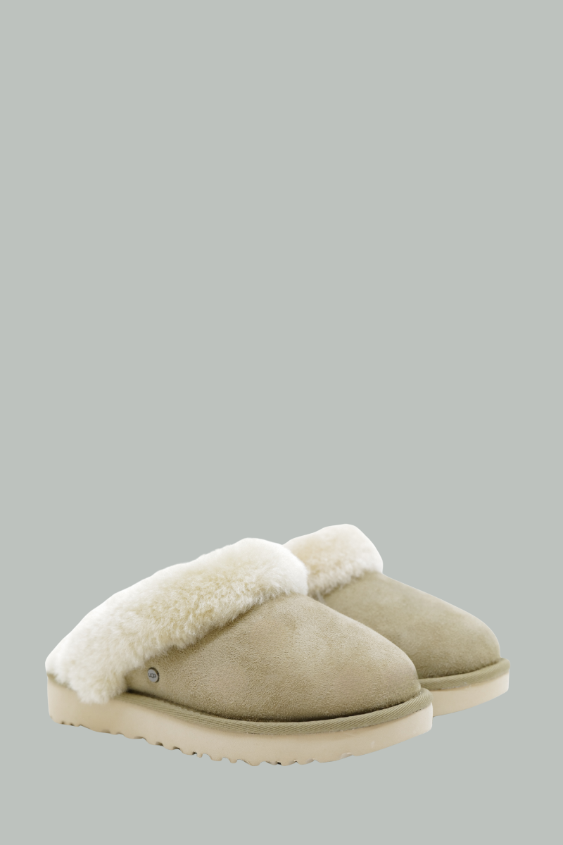 Ces chaussons UGG kaki allient confort et style avec leur col fourré et leur design élégant. Conçus en suède et doublés de laine chaude, ils offrent une douceur incomparable. Le bout rond et la semelle antidérapante en caoutchouc naturel assurent une protection et un maintien optimal tout au long de la journée. Le logo médaillon sur le côté ajoute une touche de sophistication.