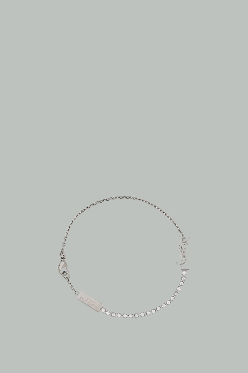 Bracelet en maille forçat orné de strass, sublimé par le Cassandre au centre. Il est doté d’un fermoir mousqueton et d’une plaque gravée Saint Laurent Paris.