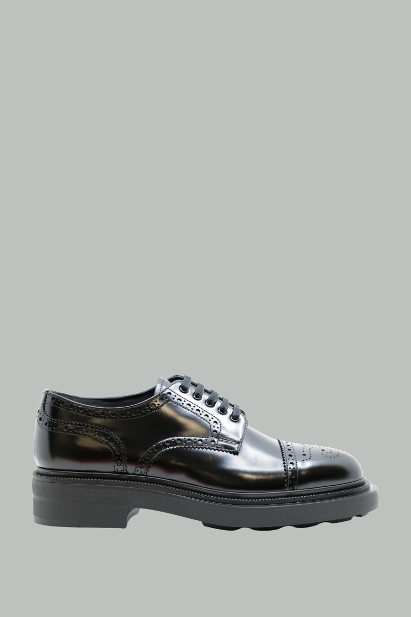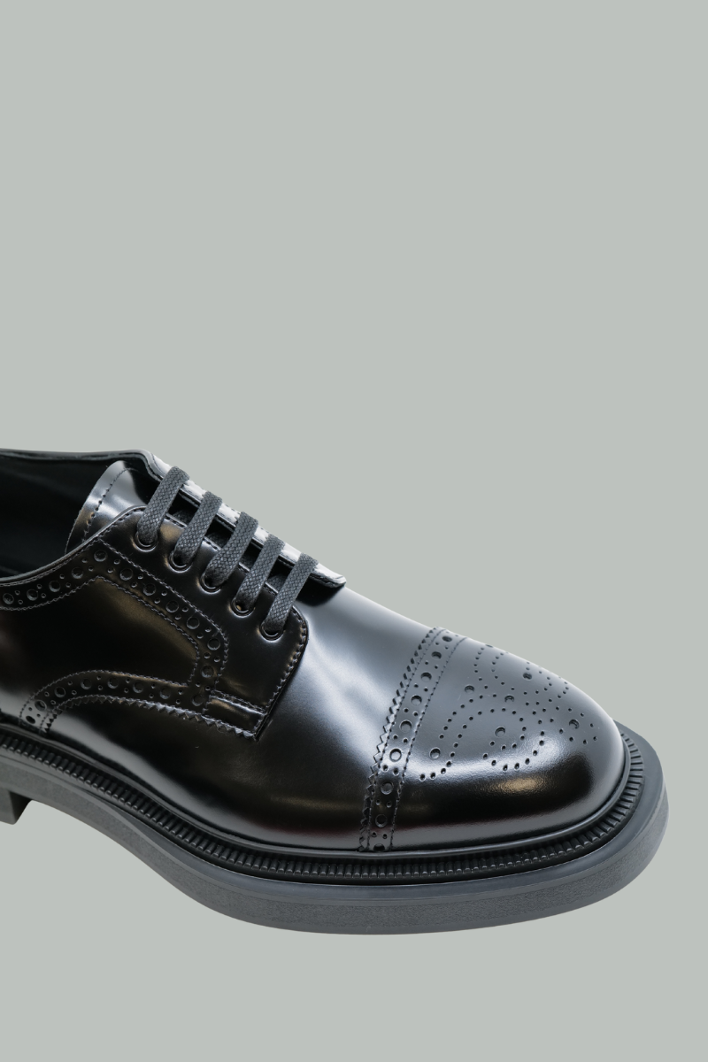 Chaussure Oxford en cuir brossé, dotée d’un bout arrondi et d’une fermeture à lacets. Elle repose sur une semelle légère et flexible de 30 mm, en cuir avec empiècement en caoutchouc pour plus de confort et de durabilité.