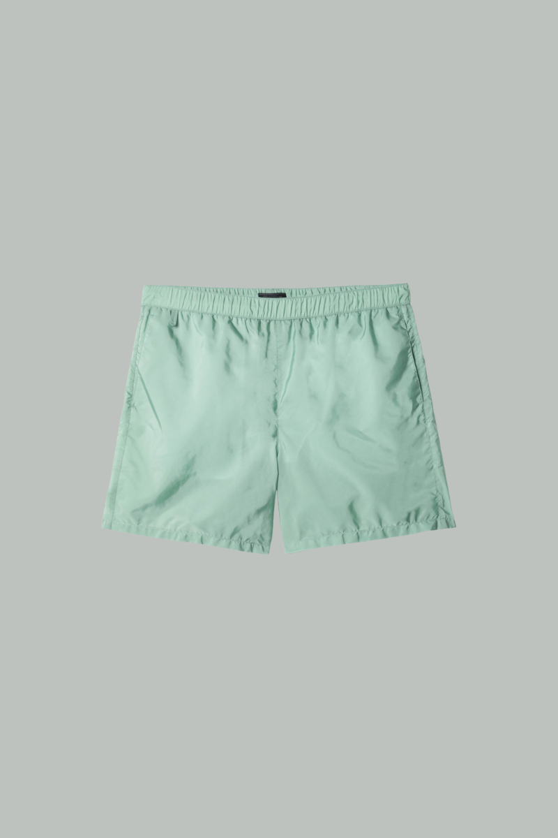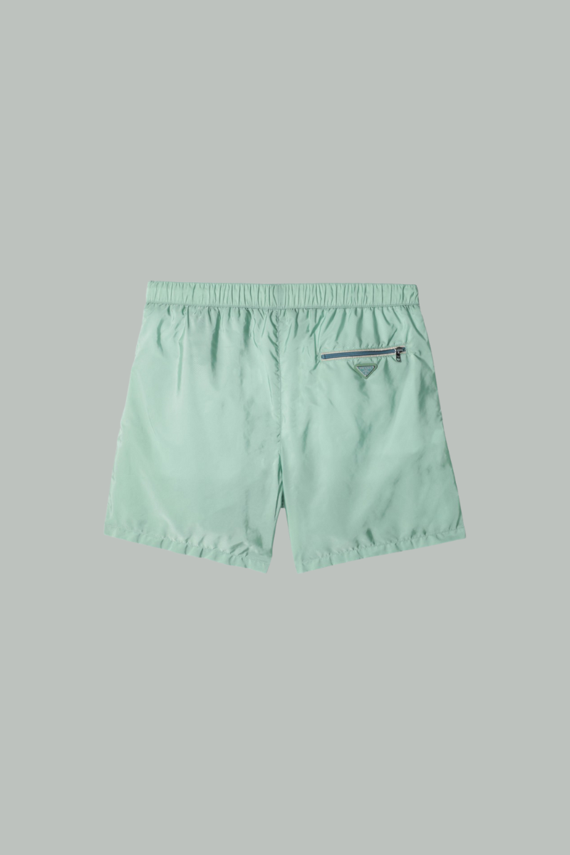 Maillot de bain Prada en Re-Nylon couleur aquamarine, caractérisé par une taille élastiquée avec cordon de serrage, deux poches latérales passepoilées, une poche arrière zippée et un logo triangle en métal émaillé au dos.
