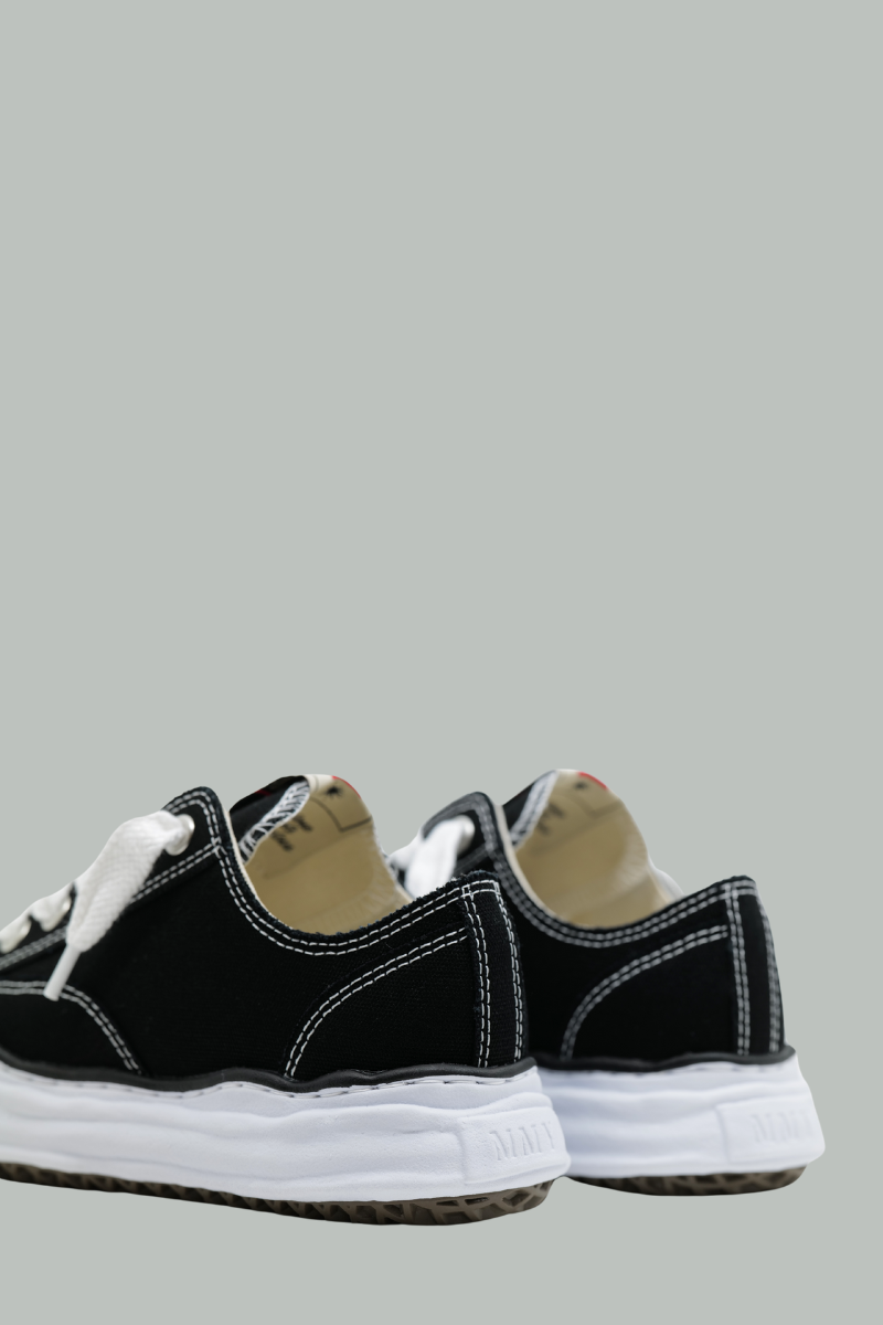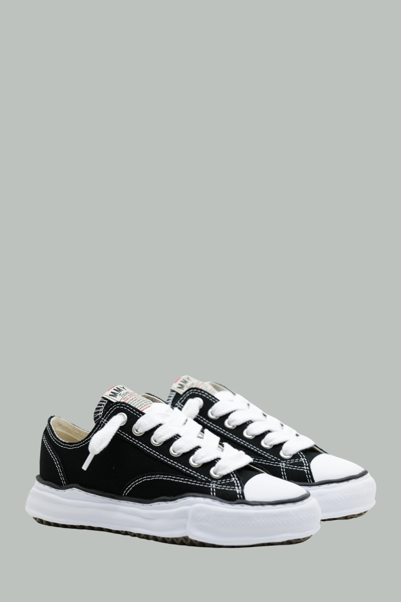 Baskets basses Peterson de Maison Mihara Yasuhiro, conçues en toile noire avec des coutures contrastées.Elles se distinguent par une fermeture à lacets, une languette ornée d’un logo et une semelle en caoutchouc blanc, alliant style et confort.