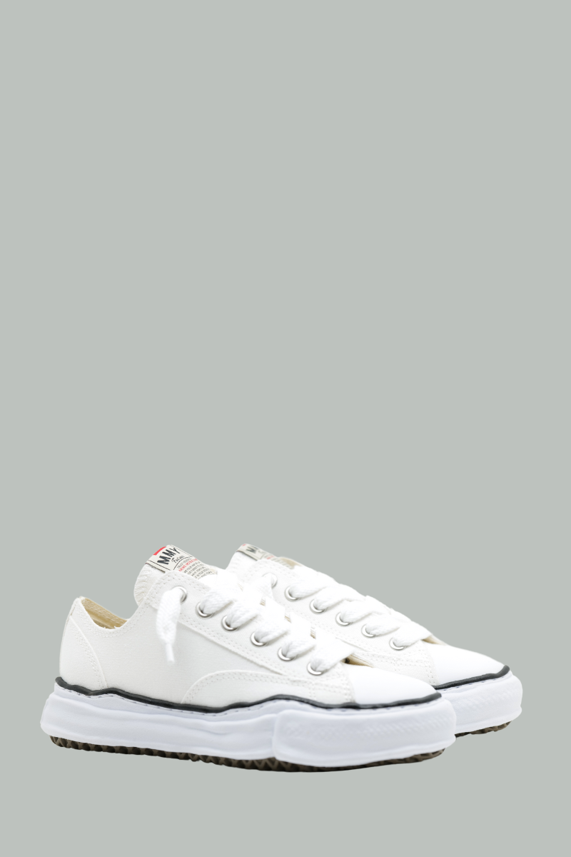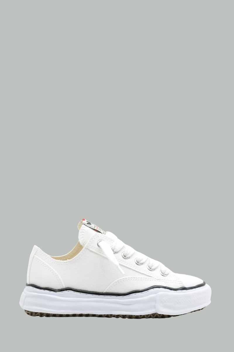 Baskets basses Peterson de Maison Mihara Yasuhiro, conçues en toile blanche avec des coutures contrastées. Elles se distinguent par une fermeture à lacets, une languette ornée d’un logo et une semelle en caoutchouc blanc, alliant style et confort.